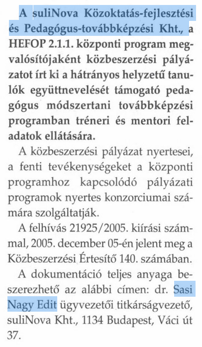 Sasi-Nagy Edit 2006-ban a suliNova Közoktatás-fejlesztési és Pedagógus-továbbképzési Kht. nevű, állami tulajdonú alapítványnál bukkant fel, amelyet 2004-ben hozott létre az SZDSZ-es Magyar Bálint vezette Oktatási Minisztérium.1 Ennél a szervezetnél töltött be ügyvezetői titkárságvezető szerepkört.