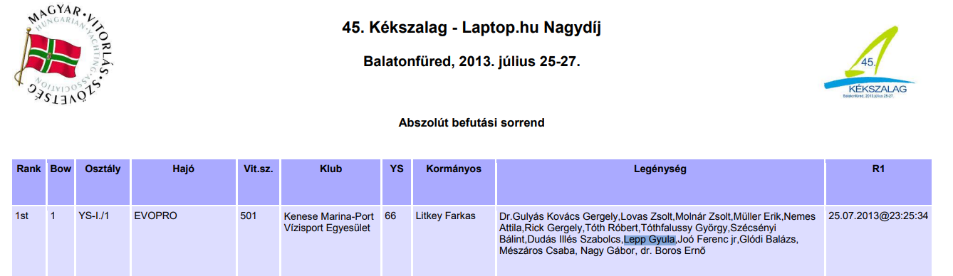 Hogy minden téren igazi csapatról van szó, az is mutatja, hogy Túri és a Poszeidon Kft.-ben szintén társtulajdonos Kornis Gábor a Kenese Marina-Port Vízisport Egyesület hajójában indultak a 2013-as Kék Szalagon – Kornis volt a kormányos.13 Az egyesület egy másik, Evopro nevű hajója lett ugyanakkor a győztes, személyesen az elnök Litkey Farkassal kormányosként és Lepp Gyulával a legénység soraiban.