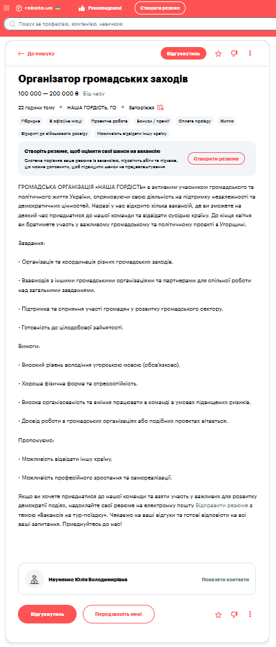 Az álláshirdetésben szereplő felhívás szerint a Büszkeségünk civil szervezet "aktív résztvevője Ukrajna köz- és politikai életének, és tevékenységét a függetlenség és a demokratikus értékek támogatására irányítja." Hogy mindez mit jelent, arra a hirdetés leírásában kapunk választ.