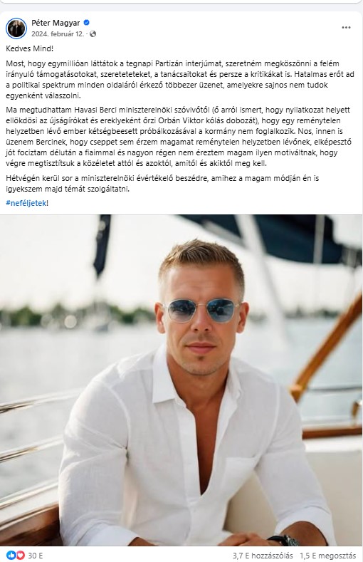 De kezdjük az elején: Magyar Péter 2024. február 12-én tett közzé először politikusként posztot. Ebben a Partizán-interjú után köszönetet mondott a támogatásért, meg hogy sokan megnézték a műsorát. Semmi különleges. Mégis elképesztő számokat produkált. Olyanokat, amire egy friss politikustól eddig nem nagyon volt példa itthon. Több mint 30 ezer interakció, közel négyezren szóltak hozzá, és ezerötszázan osztották meg. Ez teljesen irreális.