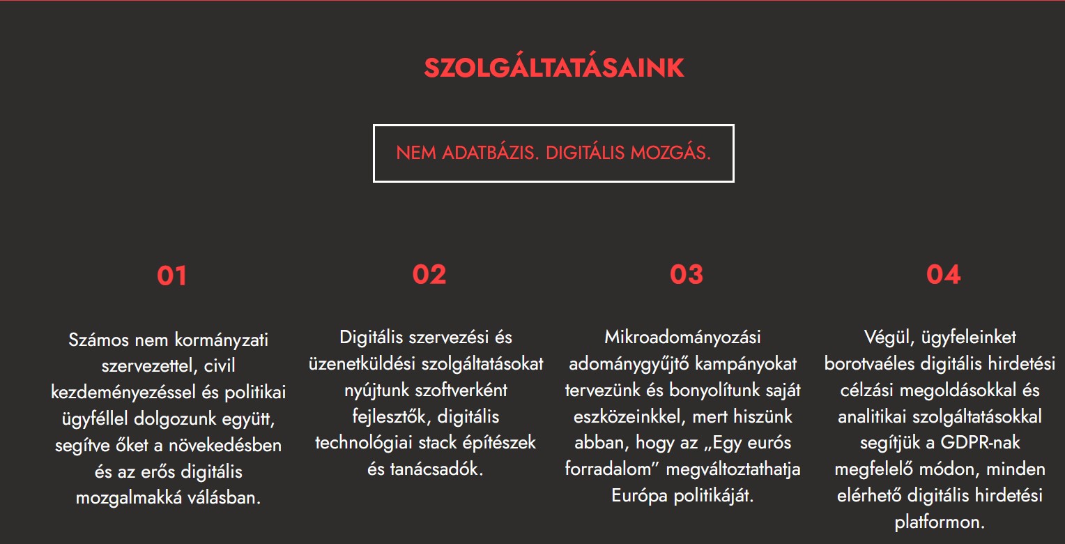 A honlapjukon saját maguk írják le, hogy különféle politikai aktoroknak segítenek a digitális növekedésben. Abból a célból, hogy erős digitális mozgalmakká tudjanak válni.
