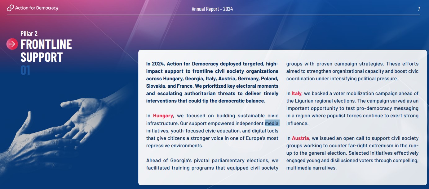 Az Action for Democracy honlapján találtunk is erre vonatkozó jeleket. A tavalyi évre szóló beszámolójukban konkrét számokat már nem találunk. A támogatásaikat nem tüntették fel, és a bevételeikről sem számoltak be. Egy olyan információt azonban elhintettek, ami magyarázatot ad az eddigiekre.