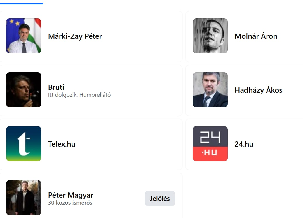 - Itt van Balla Ferenc nevű álprofilunk. A valóságban nem létező férfi kizárólag Magyar Pétert, Márki-Zay Pétert, Molnár Áront és Brutit, a "humoristát" követi. Profilkép, borítókép nincs, tevékenység nincs, ismerősök sincsenek. Csak buzgó interakciók.