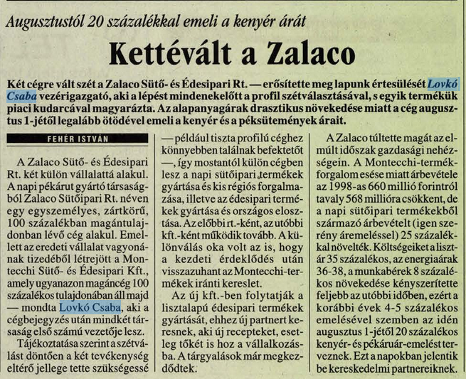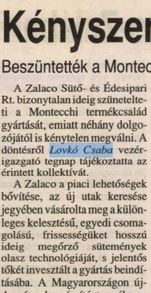 Lovkó Csaba 1998-ban lett a Zalaco nevű sütőipari cég vezérigazgatója. Ekkor egy új termék piacra vezetésével kísérletezett a vállalat, ami mindössze két év alatt megbukott. Magyar Péter jelöltje felelősségvállalás helyett elbocsátotta a termék előállítását végző embereket.