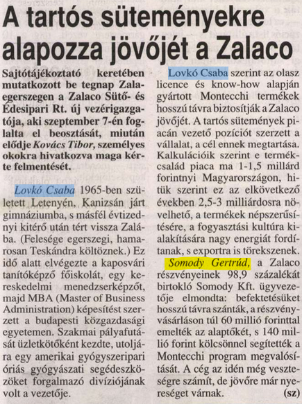 A Zalaco 98,9 százalékos tulajdonosa ugyanis ekkoriban nem volt más, mint Somody Gertrúd, a Pharmavit nevű gyógyszergyártó cég alapítójának, az akkor ereje teljében lévő MSZP holdudvarába tartozó Somody Imrének a nővére.