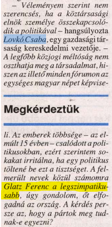 Ennek megfelelően lelkesen támogatta a szocialistákat, 2005-ben például az MSZMP-s miniszterből lett szocialista köztársági elnök-jelölt Glatz Ferencet támogatta. Politikai éleslátását- vagy rosszabb esetben hazugságra való hajlamosságát- jól mutatja, hogy Glatzot "politikán kívüli" személyként írta le, aki képes egyesíteni a politikai táborokat.