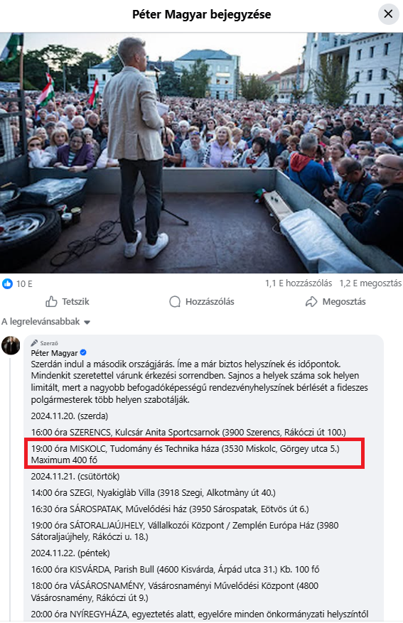 Ennek azért van jelentősége, mert ahogy az Ellenpont észrevette: Magyar Péter még az első országjárása idején éppen a Tudomány és Technika Házát jelölte meg miskolci rendezvényének helyeként.11 Ez pedig nem kevesebbet jelent, minthogy