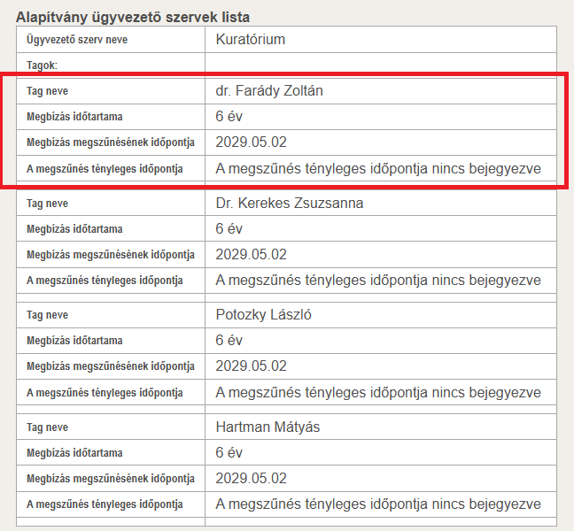 Ezt erősíti, hogy a civil szervezetek hivatalos, bírósági adatbázisában is az Ökotárs kurátoraként van feltüntetve a neve, megbízatása három és fél év múlva, 2029 májusában jár le.
