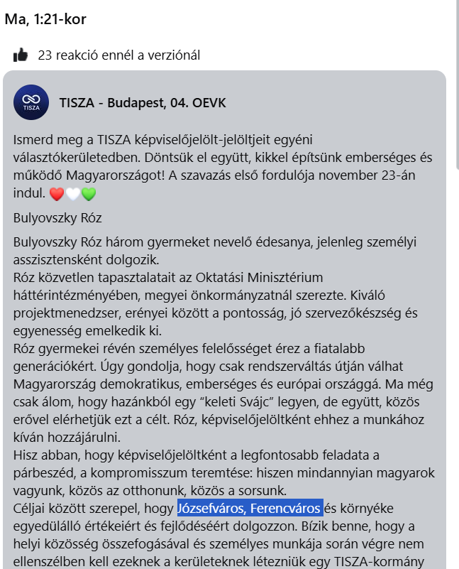 A Tisza Párt jelölt-jelöltjeinek bejelentése órákig húzódott, valószínűleg azért, mert kétségbeesetten próbálták betömni a lyukakat - vagyis a hiányzó helyeket.Utólag több jelölt bemutatkozását is módosítani kellett, mert más kerületben indultak, mint amiről tudtak, vélhetően az utolsó pillanatban a pártvezetés átpakolta őket. Ilyen volt Bulyovszky Róz, aki eredetileg a Józsefvárost és Ferencvárost érezte magához közelnek, aztán megtudta, hogy mégis a II-III.kerületben indul.