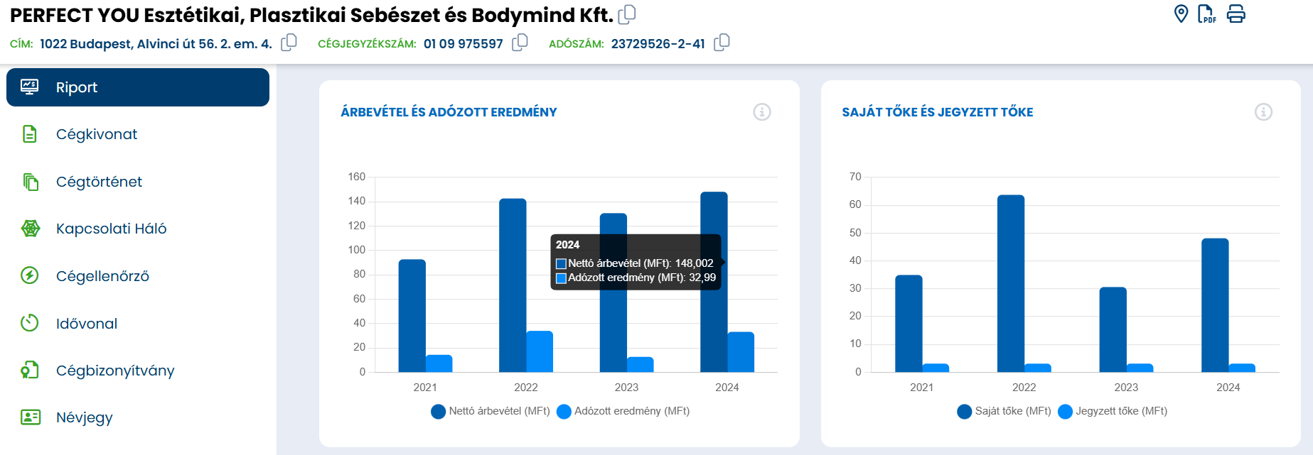 A vállalkozás tulajdonosa a férj, dr. Bulyovszky István, de azt közösen vezetik, és mindketten cégjegyzésre jogosultként szerepelnek az adatbázisban. A PERFECT YOU Esztétikai, Plasztikai Sebészet és Bodymind Kft. – bár hivatalosan mikrovállalkozás – stabilan működik: legutóbb 148 millió forint árbevételt és 33 millió forint adózás utáni nyereséget tudott felmutatni.