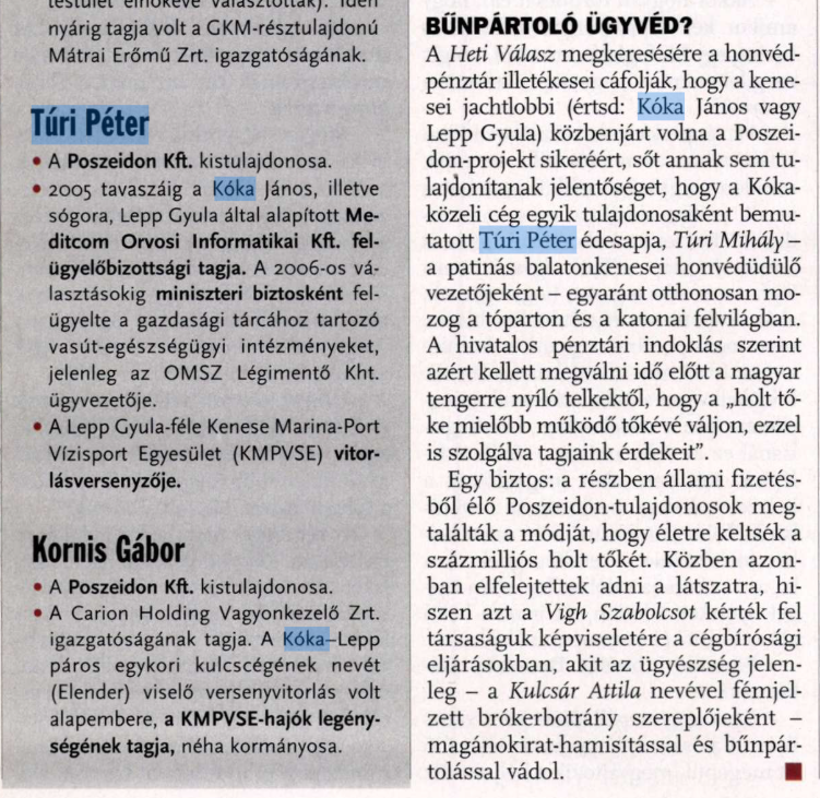 2007-ben foglalkozott vele és Kóka stábjával részletesebben a jobboldali sajtó: a Heti Válasz írta meg, hogy a Kóka Jánoshoz is köthető, akkori Poszeidon Kft. egyik tulajdonosaként a 2008-ra számított piaci ár harmadáért jutottak hozzá egy balatonkenesei partszakaszhoz.3