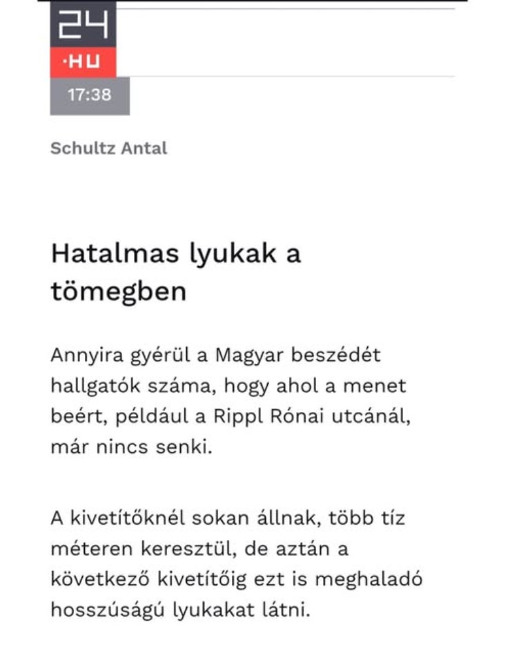 A szintén ellenzéki 24.hu 17.38-kor (Magyar Péter beszédének felénél) viszont még azt is elárulta, hogy a Rippl-Rónai utcánál már nincs is senki. A Rippl-Rónai utca a legelső (!) kereszteződés az Andrássy úton a Hősök tere előtt, száz méterre sincs a tértől, nem hogy két és fél kilométerre, amit Szabó Andrea vízionált.