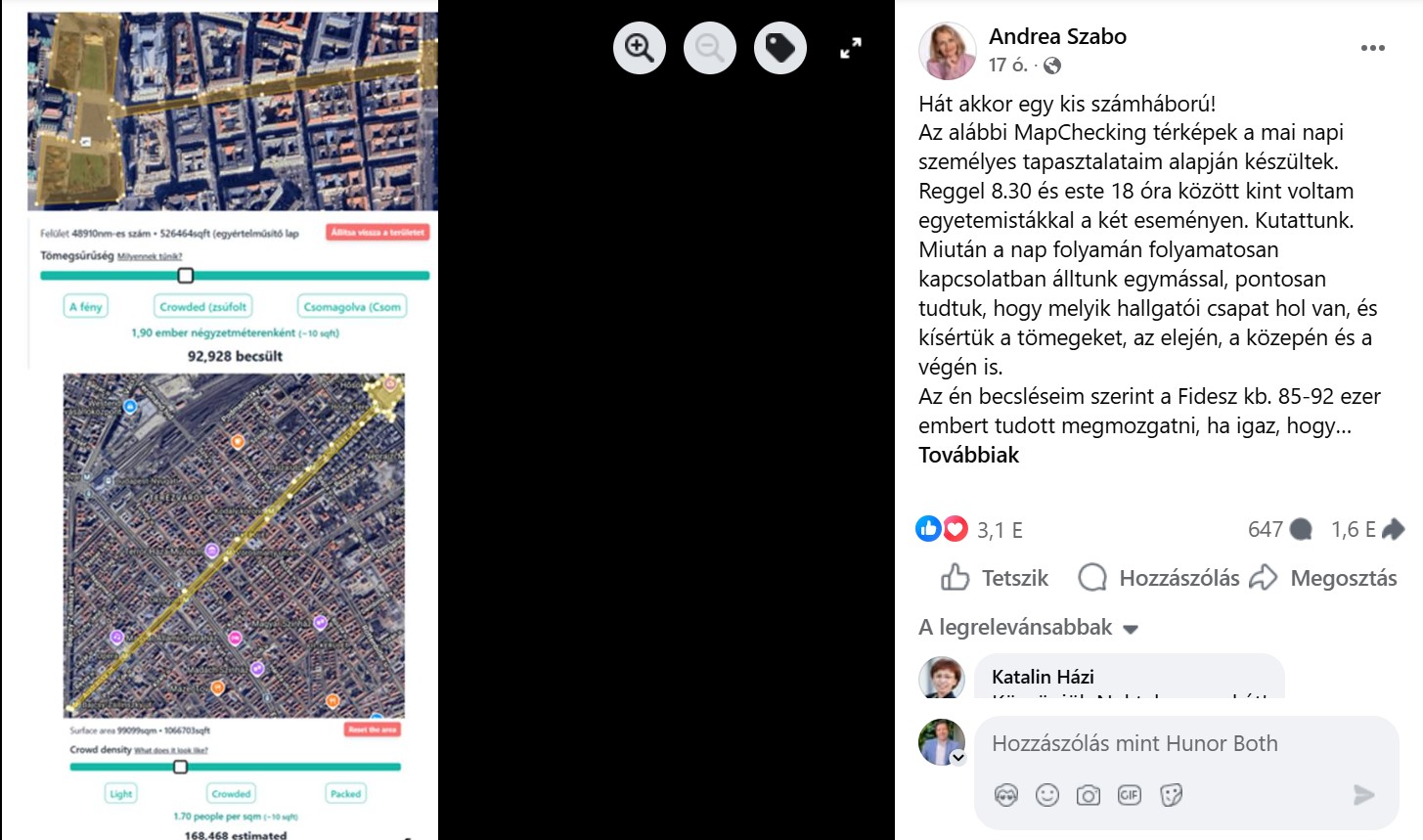 Az állítás azonban feltűnő hazugság, egy Szabó Andrea által hamisított térképen alapszik, amely durván alábecsüli a Békemenet résztvevőinek számát, és durván eltúlozza a Tisza rendezvényéét.