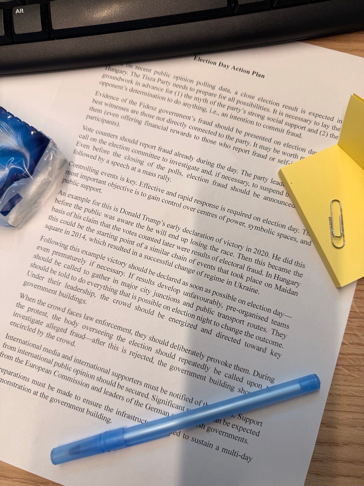 Magyar Péterék "választásnapi akcióterv" című dokumentuma, az irat pedig a következőkről szól: Magyarországon szoros választási eredmény várható, a Tisza Pártnak fel kell készülnie a vereségre.