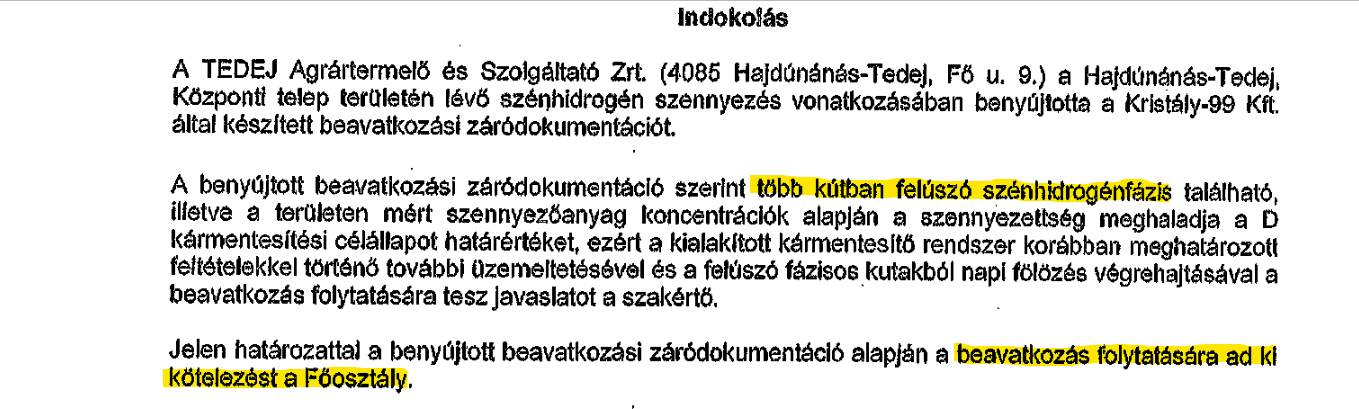 Az eljárás iratai alapján tehát a Tedej Zrt. már közel 20 éve tudott arról, hogy az általuk elhelyezett üzemanyagtartályok mérgező anyagokkal szennyezik a talajt, valamint a környező kutakat, mégsem tettek gyakorlatilag semmit a helyreállítás érdekében. Az eljárási szabályok kiskapuit kihasználva rendszeres hosszabbításokat erőszakoltak ki, és annak ellenére sem számolták fel a szennyezést, hogy emiatt több hektár föld, illetve a környező kutak is szennyeződtek.