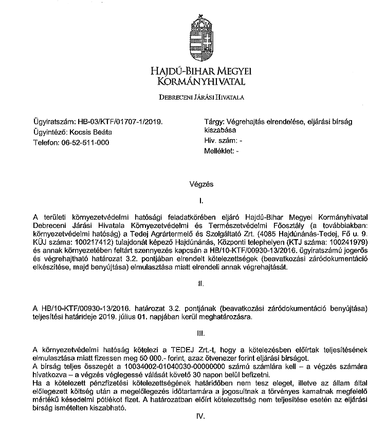 - 2019. február 22. – A hatóság végrehajtást rendelt el és eljárási bírságot szabott ki, mert a Tedej Zrt.-nek 2019. január 31-ig beavatkozási záródokumentációt kellett volna benyújtania, de ez nem történt meg.
