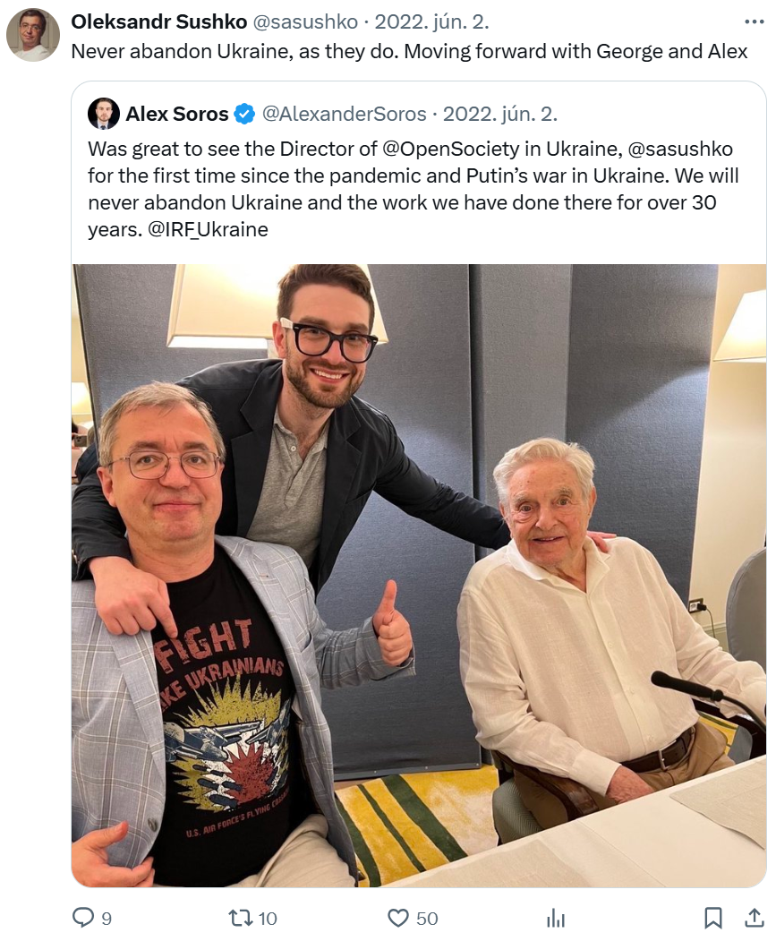 Az ukrán Soros-alapítvány elnöke, Olekszandr Szuskó 2018 óta vezeti az intézményt. Szuskó nyíltan politikai szereplőként viselkedik: közösségi oldalain Orbán Viktort és a magyar kormányt támadó bejegyzéseket oszt meg, miközben Zelenszkij "Orbán megszégyenítéséről" szóló kijelentéseit is terjeszti.