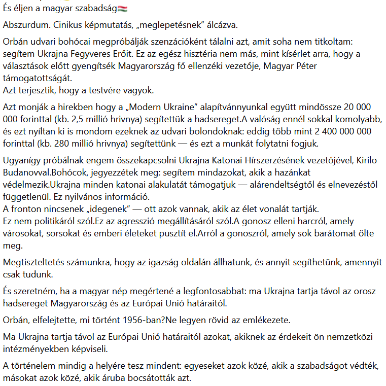 "Azt monják a hirekben (sic!) hogy a "Modern Ukraine" alapítvánnyunkal együtt mindössze 20 000 000 forinttal (kb. 2,5 millió hrivnya) segítettük a hadsereget.A valóság ennél sokkal komolyabb, és ezt nyíltan ki is mondom ezeknek az udvari bolondoknak: eddig több mint 2 400 000 000 forinttal (kb. 280 millió hrivnya) segítettünk — és ezt a munkát folytatni fogjuk"-ígéri Ceber, bejegyzését betű szerint idéztük.
