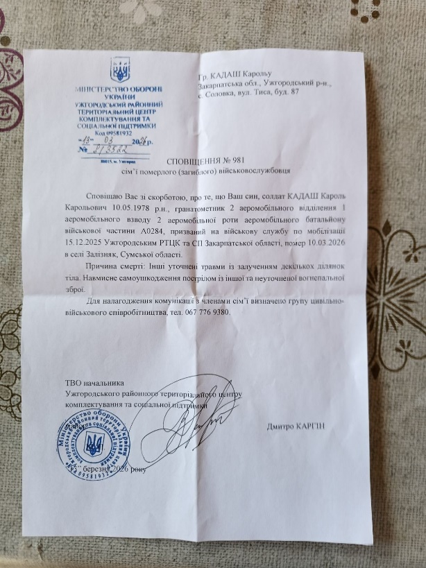 A családtagokat nem sokkal később Dmitro Karhin az ungvári területi toborzóközpont (TCK) vezetője levélben tájékoztatta a tragédiáról. Az Ellenpont birtokába jutott hivatalos dokumentumban szinte szó szerint ugyanaz szerepel, mint a jegyzőkönyvben: Kádas Károly "szándékos önkárosítással", egy ismeretlen lőfegyverrel vetett véget az életének. Egész pontosan így írtak az esetről: