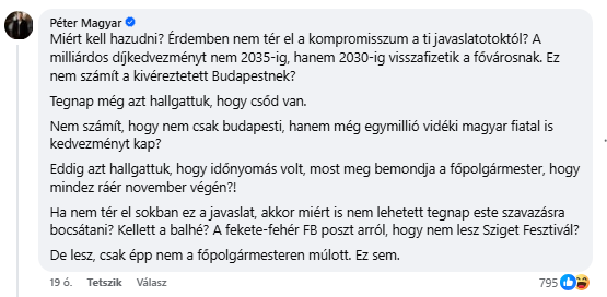 A főpolgármester előbb egy négyperces - láthatóan Gerendai "árulása" miatt sértődött - videóüzenetben reagált az elhangzottakra, amiben igyekezett megmagyarázni a saját álláspontját és odaszúrt a Tisza elnökének.12 Magyar nem hagyta szó nélkül, és személyeskedő hozzászólást írt a bejegyzés alá.