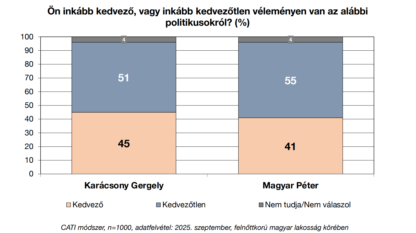 A megkérdezettek 55 százaléka rossz véleménnyel van a pártelnökről, a főpolgármesternél ez a szám kisebb, 51 százalék. Mindebből az következik, hogy Karácsony Gergelynek jobbak az esélyei a kormánypártokkal szemben 2026 áprilisában. Ráadásul a tendencia is Karácsony mellett szól. Okkal feltételezhető, hogy hasonló adatokat mértek a Manfred Weber vezette Európai Néppárt által megrendelt kutatások is.