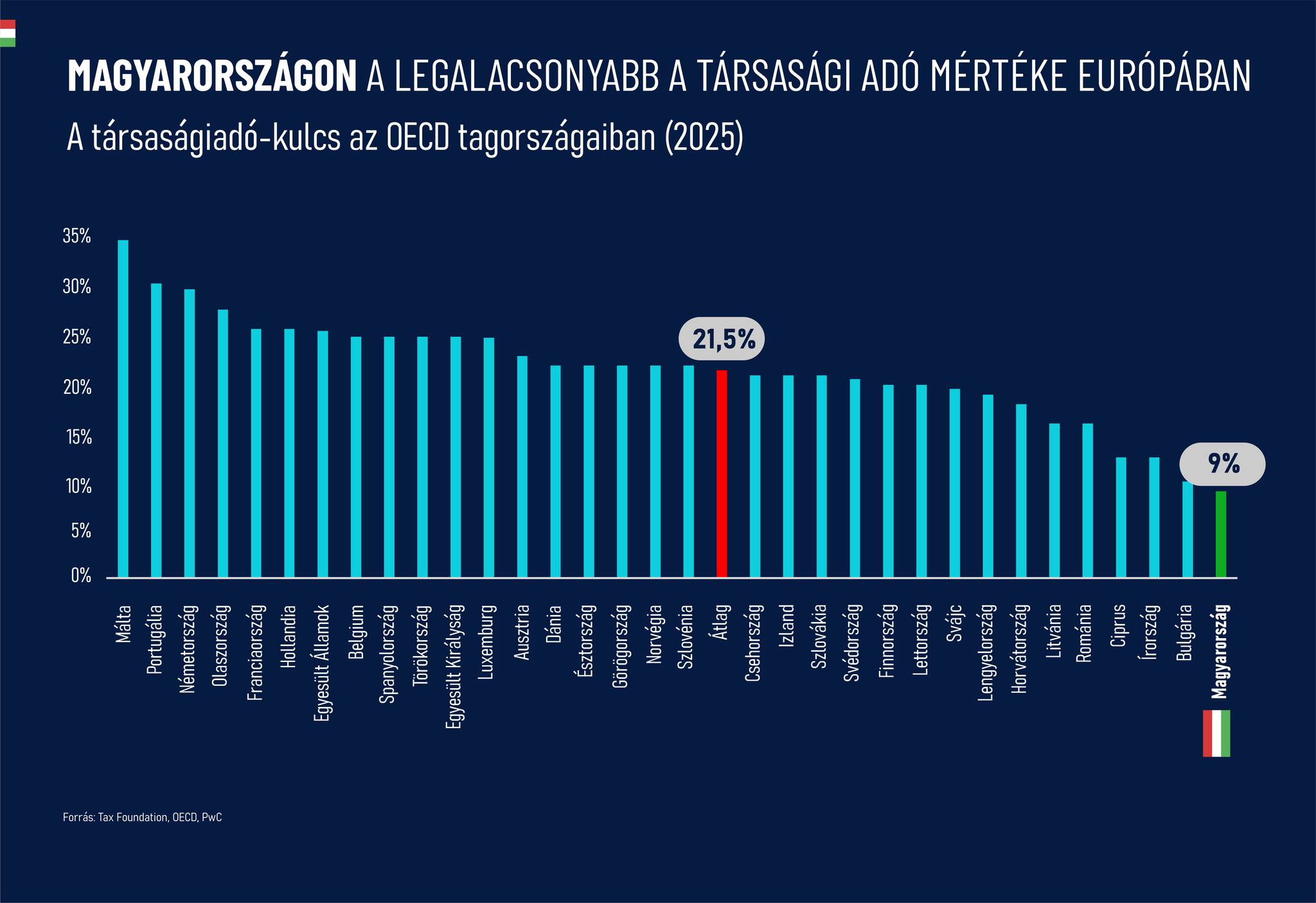 Magyarországon jelenleg Európa legalacsonyabb TAO-kulcsa (9%) működik,3 amely, versenyelőnyt jelentett hazánknak a külföldi beruházások elnyerésében. Többek között ennek is köszönhető, hogy 2023-ban Magyarországra több külföldi működőtőke, vagyis beruházás érkezett, mint a nálunk nyolcszor nagyobb Németországba,4 2024-ben pedig minden Európába érkező kínai befektetés egyharmada Magyarországra érkezett, 3,1 milliárd euró értékben.5