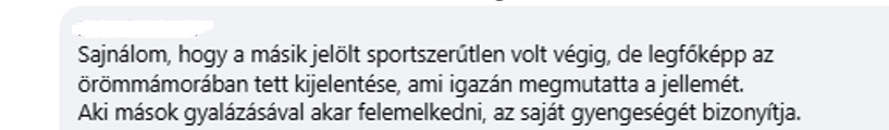 Egy másik hozzászóló sportszerűtlenséggel vádolta meg Bárkányit, hozzátéve, hogy "az örömmámorában tett kijelentése" megmutatta az igazi jellemét. "Aki mások gyalázásával akar felemelkedni, az saját gyengeségét bizonyítja" – egészítette ki az előbbieket. Páger szívecskével díjazta a véleményt.