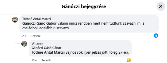 A sátoraljaújhelyi képviselő egyik támogatója arról számolt be, hogy rejtélyes okoknál fogva a családjából legalább hatan nem tudtak szavazni. Gánóczi ahelyett, hogy tagadta volna a dolgot, a nyilvánosság előtt ráerősített erre, és azt írta: