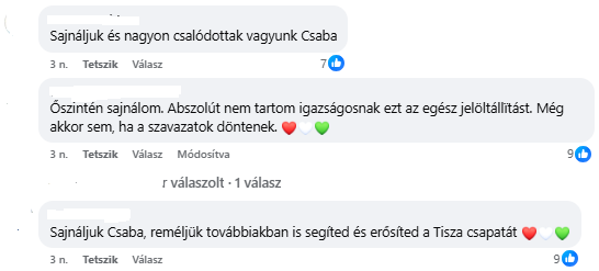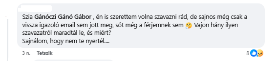 "Én is szerettem volna szavazni rád, de sajnos még csak a vissza igazoló email sem jött meg, sőt, még a férjemnek sem. Vajon hány ilyen szavazatról maradtál le, és miért? Sajnálom, hogy nem te nyertél" - írta egy másik hozzászóló, amire a tiszás jelölt lájkkal reagált.