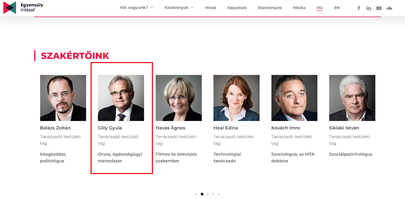 Talán a fentieknél is erősebb kapcsot jelent a globalista körökhöz, hogy Gilly Gyula jelenleg is az Egyensúly Intézet egészségügyi szakértője.15