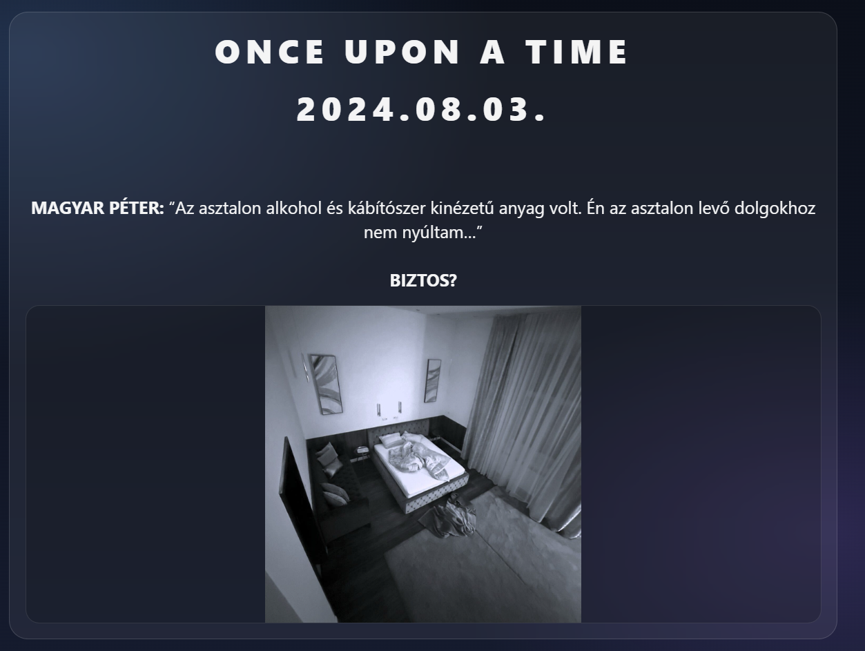 A felülről rögzített, fekete-fehér képen egy széttúrt ágy, a mellette lévő éjjeliszekrényen pedig egy tálcára szórt fehér por – vélhetően kábítószer – is kivehető. Később egy dátummal frissült a felület: 2024. augusztus 3.4