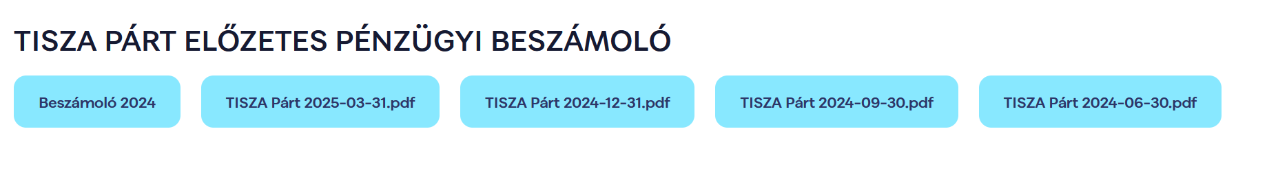 Miután a kezdeti ígéretek sorra bedőltek, a Tisza Párt transzparenciát hirdetett: ígéretük szerint negyedévente nyilvánosságra hozzák a pénzügyi beszámolókat8 . "A TISZA Párt áll bármilyen pénzügyi vizsgálat elébe,