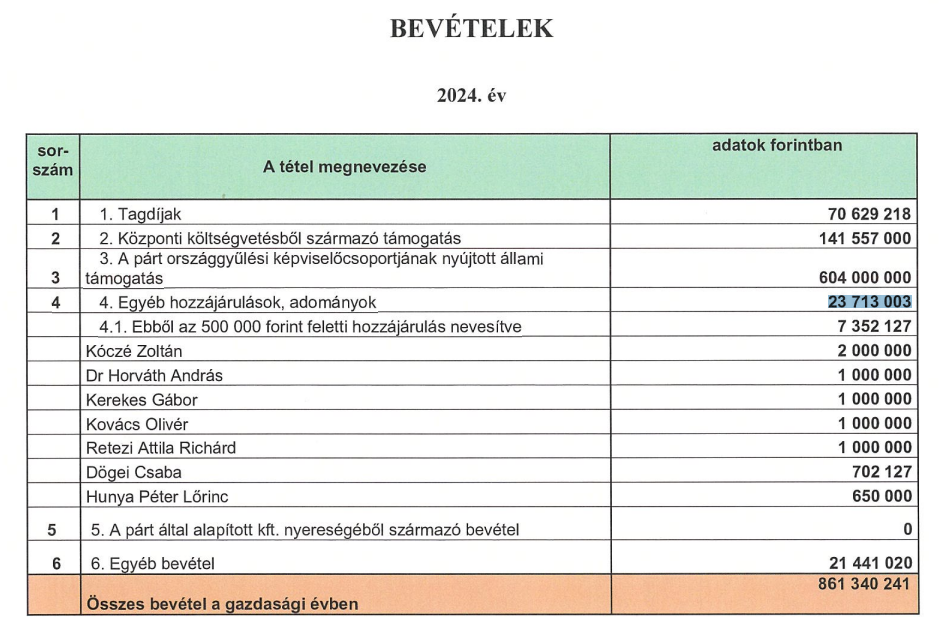 a Momentumnak a 2024-es évben összesen 861 millió forint bevétele volt, ám ebből 745 milliót tett ki a központi költségvetésből származó támogatás, illetve a párt országgyűlési képviselőcsoportjának nyújtott támogatás.