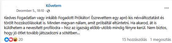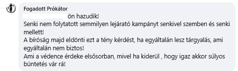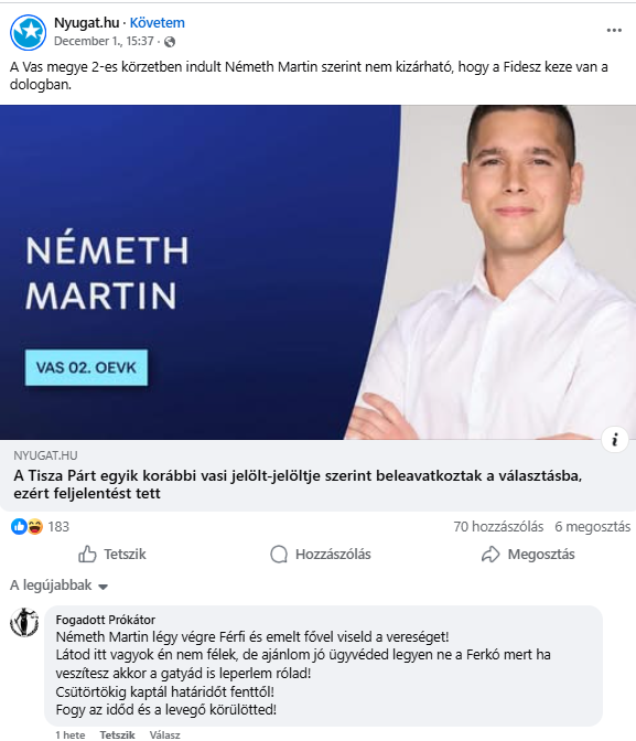 Találtunk egy másik érdekes kommentet a Nyugat.hu december elsejei posztja alatt. Ebben a Fogadott Prókátor megfenyegette Németh Martint, azt írva, hogy viselje emelt fővel a vereséget. Majd ultimátumot adott a tiszás politikusnak: vonja vissza a feljelentést, különben beleáll az ügybe. "Látod, itt vagyok én nem félek, de ajánlom jó ügyvéded legyen" – írta fenyegetőzve.