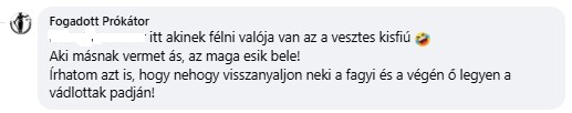akinek itt félni valója van az a vesztes kisfiú. (Németh Martin – szerk.) Aki másnak vermet ás, az maga esik bele! Írhatom azt is, hogy nehogy visszanyaljon neki a fagyi és a végén ő legyen a vádlottak padján!