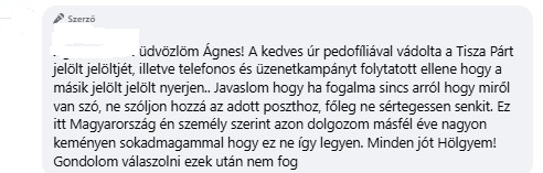 Miután páran becsatlakoztak a csetelésbe, Németh Martin támogatója kifejtette, miről is megy a vita. "A kedves úr pedofíliával vádolta a Tisza Párt jelölt jelöltjét, illetve telefonos és üzenetkampányt folytatott ellene, hogy a másik jelölt-jelölt nyerjen" – ismertette az ügy hátterét.