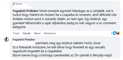 A poszt alatt aztán érdekes beszélgetés bontakozott ki a tiszás aktivista és a Fogadott Prókátor között. A kamuprofil végig tartotta a pedofilvádakat és először azt írta a bejegyzésre reagálva, hogy