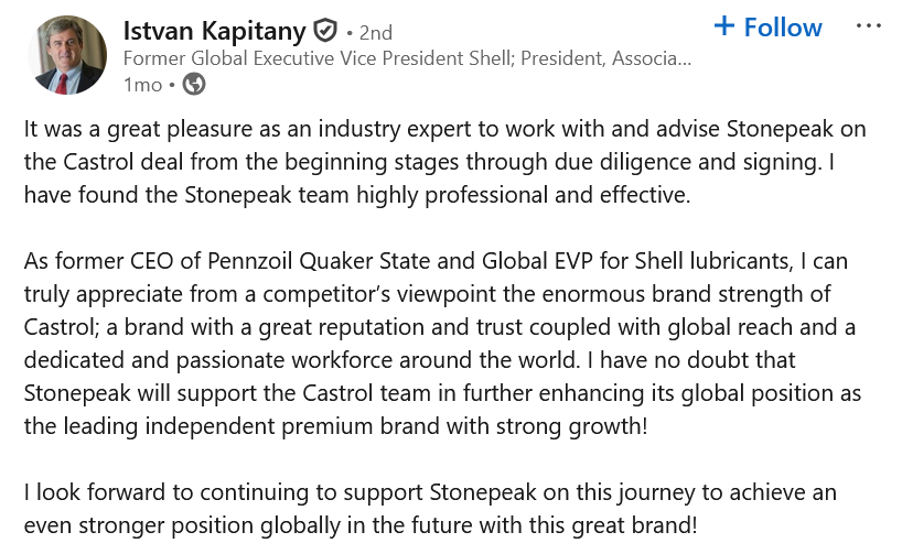 Már meglehetett a csatlakozási megállapodás a Tisza Párttal, amikor Kapitány István bejelentette, a Stonepeak lezárta a Castrol nevű kenőanyaggyártó óriásvállalat többségi tulajdonrészének akvizícióját, amelynek felvásárlását saját bevallása szerint ő maga javasolta a Stonepeaknek, és amely üzletben a
