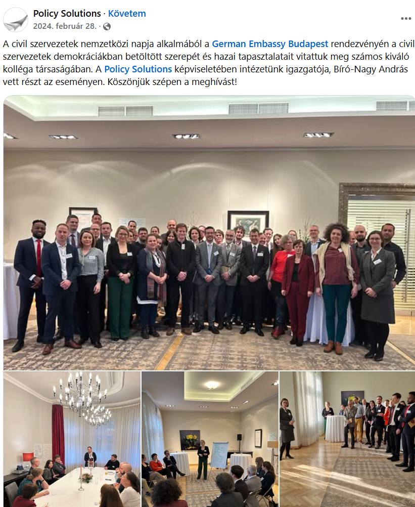 A Policy Solutions emellett rendszeresen képviselteti magát nagykövetségeken is: saját közösségi médiás felületük tanúsága szerint a német,5 a dán6 és a belga követségen is megjelentek.7 Információink szerint a kutatóintézet egyik fő bevételforrása az kifejezetten a budapesti követségek részére személyre szabott politikai országjelentések elkészítése.