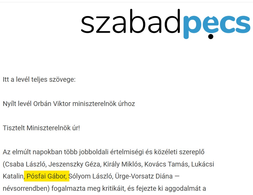 Pósfaira ráadásul a CEU melletti kiálló személyként is hivatkoztak, amikor a kormány a többi egyetemhez azonos feltételeket kívánt kikényszeríteni a Soros György által alapított intézményből. A Szabad Pécs által hivatkozott petícióban, mint jobboldali személy hivatkoznak rá, holott erre semmilyen jel nem mutatkozott, a baloldaliságára annál inkább.5