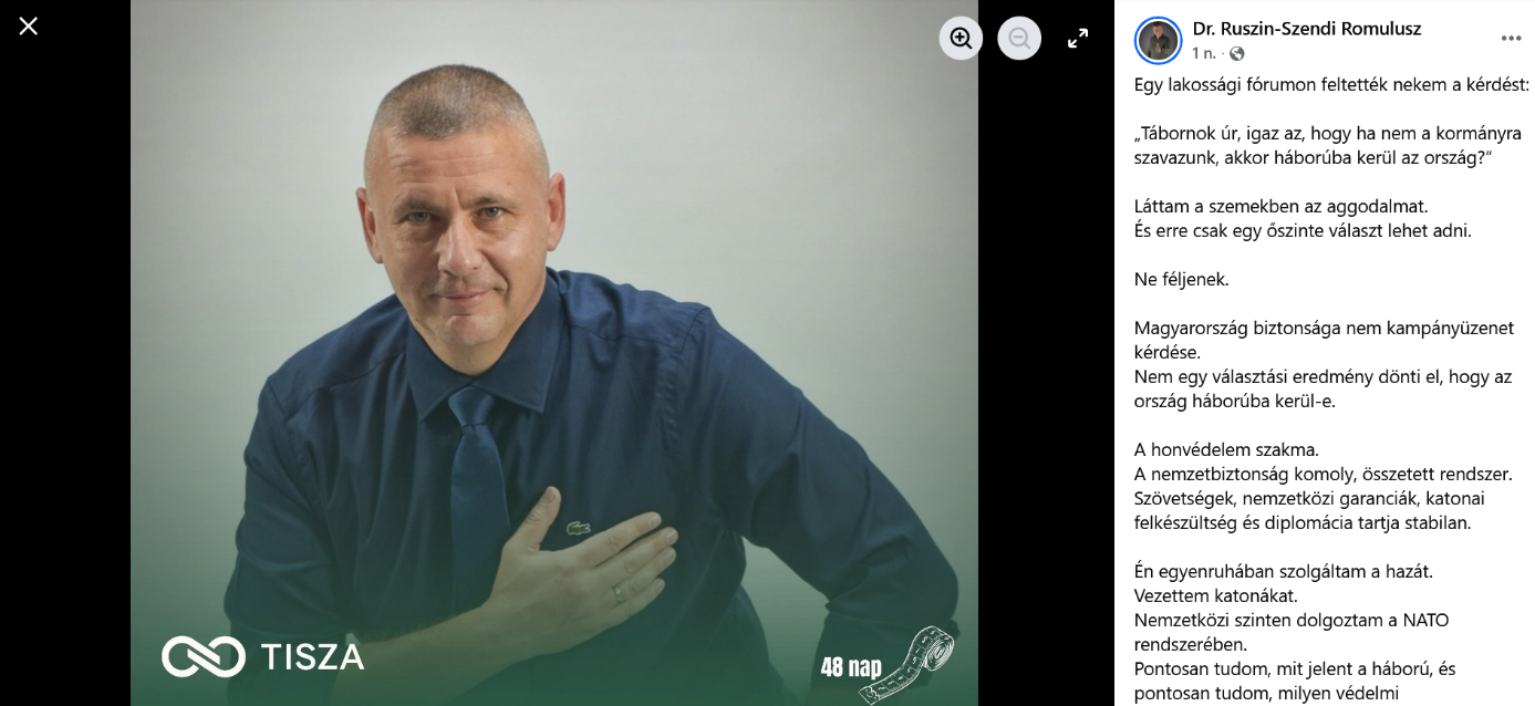A legkevésbé sem megnyugtató üzenetet tett közzé közösségi oldalán Ruszin-Szendi Romulusz, a Tisza Párt háborúért felelős szakértője. Ruszin a Facebookon számolt be egy fórumról, ahol fiatalok keresték meg azzal, hogy vajon tényleg háborúba lép-e Magyarország, ha a Tiszára szavaznak. Ruszin-Szendi itt válaszolhatta volna azt, hogy nem, ehelyett egészen mást írt ki közösségi oldalára.1