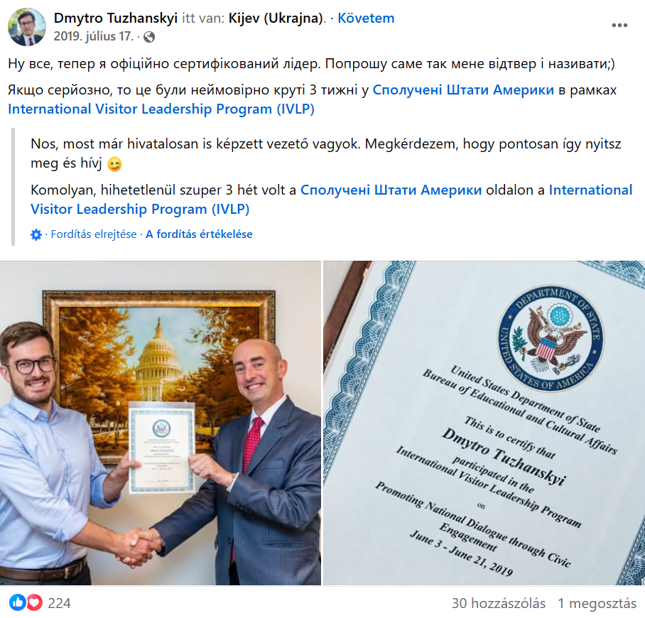 Itt jön képbe az Ellenpont által már megírt Dmitro Tuzsanszkij, aki Magyar Pétert "a magyar Zelenszkij"-nek nevezte, és egy korábbi Re:Open-en is fellépett.24 Az ukrán politológus több nemzetközi ösztöndíjprogramban részt vett – köztük jelenleg is ösztöndíjas kutatóként szerepel a Bajnai Gordonhoz kötődő GLOBSEC honlapján, ahol nemrégiben Magyar jobbkeze, Tarr Zoltán is fellépett előadóként. Tuzsanszkij korábban a German Marshall Fund Politikai Tervezők Hálózatának ösztöndíjasa volt, amelyet a Soros György-féle Open Society is támogatott.