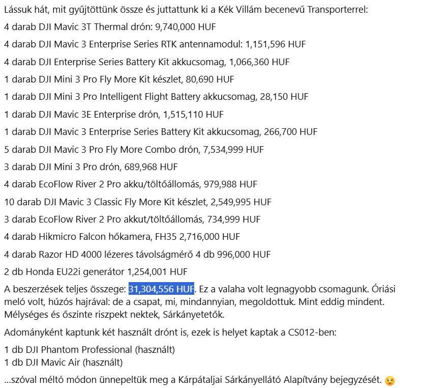 Bár beszámolnak klasszikus humanitárius akciókról, például Erős Pista-küldeményes vagy óvodaépítéses projektekről is, a szervezet leginkább drónokat és technikai eszközöket szállít az ukrán hadseregnek. Volt, hogy egyetlen tétel 31 millió forintot tett ki.3