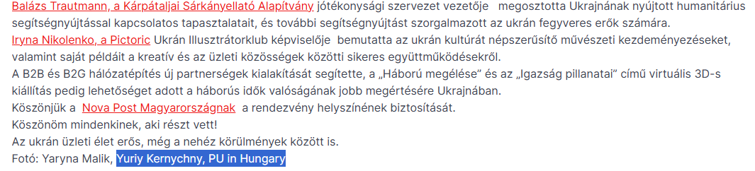 Az összejövetelen ukrán és más nemzetiségű diplomaták – közte Fegyir Sándor nagykövet –, vállalkozók képviseltették magukat – a "fotósok" között pedig feltűnik Jurij Kernicsnij (Yuriy Kernychny, Juroj Kenicsi) első titkár neve is a nagykövetség képviseletében, aki szinte biztosan azonos azzal a személlyel, akit azóta kémgyanú okán kiutasítottak Magyarországról.19