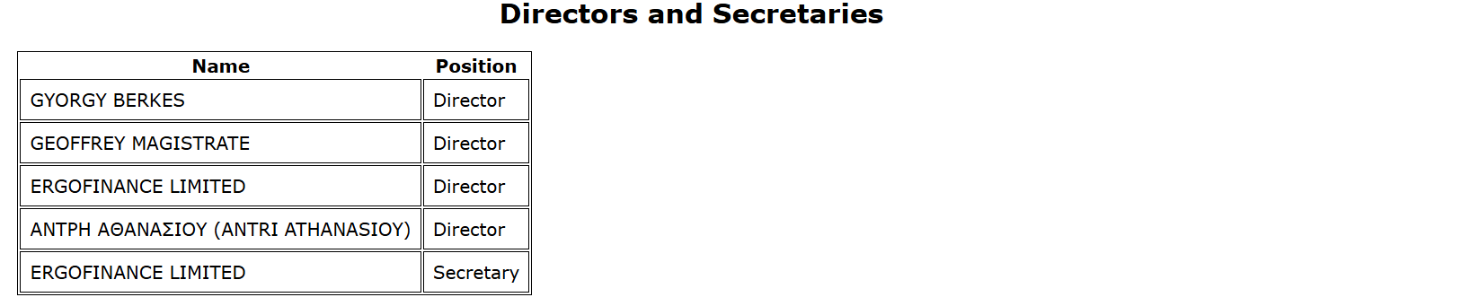 A vezető tisztségviselők között igazgatóként szerepel Berkes, de ugyanott egyéb személyek és további vállalatok is feltűnnek tisztségviselőként.19 Közöttük a ciprusi illetőségű Geoffrey Magistrate neve jellegzetes: Magistrate több száz (!) helyen bukkan fel más adatbázisokban – többek között a ciprusi,20 21 Brit-Virgin-szigeteki,22 anguillai,23 de egyesült királyságbeli regiszterekben is.24