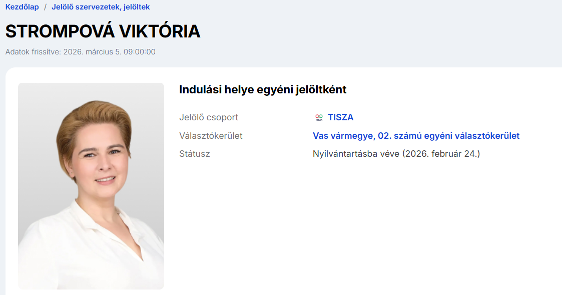 Strompová Viktória a Tisza Párt országgyűlési képviselőjelöltje a Vas vármegyei 02. számú egyéni választókerületben (Sárvár és környéke).1Bemutatkozásában arról írt, hogy "Tizenhat éve dolgozik idegenvezetőként. A Sárváriakért Egyesület elnökeként és önkormányzati képviselőként naponta tapasztalja, milyen erő rejlik a közösségben, és mit jelent felelősen képviselni másokat. Magát magabiztos, alkalmazkodó, diplomatikus, tettre kész embernek tartja." A bemutatkozás arra utal, mintha régóta képvisené a helyi közösséget, valójában azonban csak szűk két éve önkormányzati képviselő.