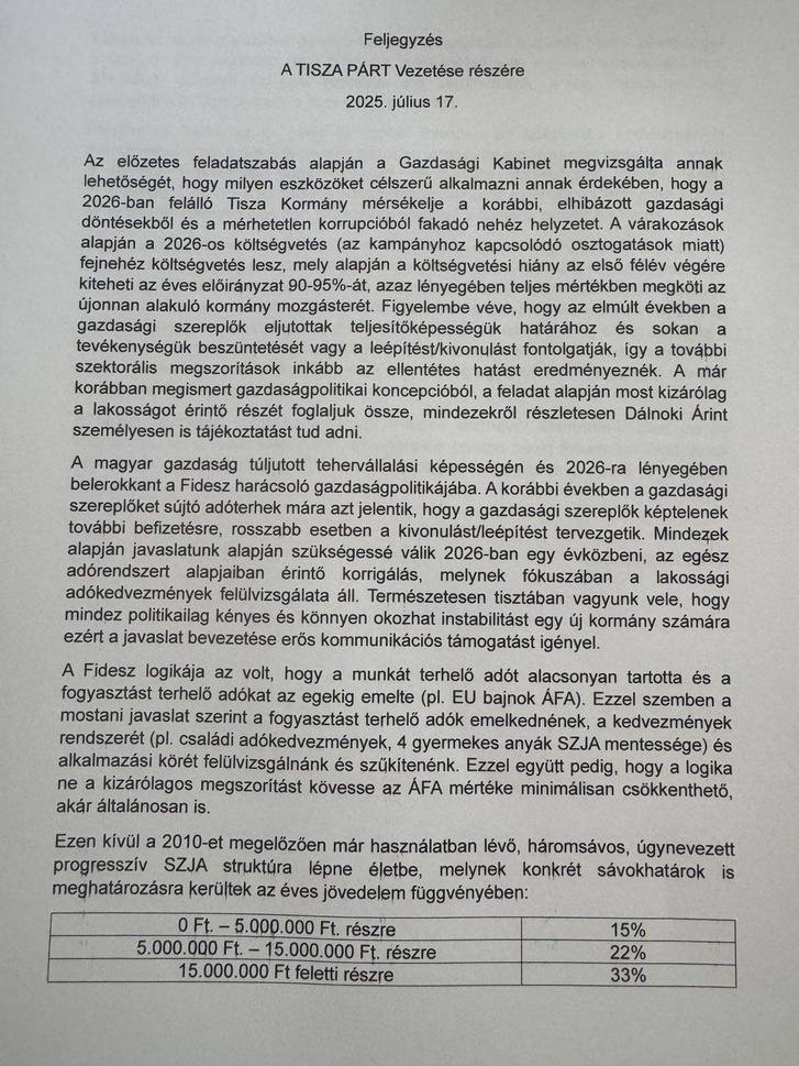 A lakossági megtakarításokra vonatkozó adót már az idén be akarja vezetni a Tisza Párt a dokumentum szerint.