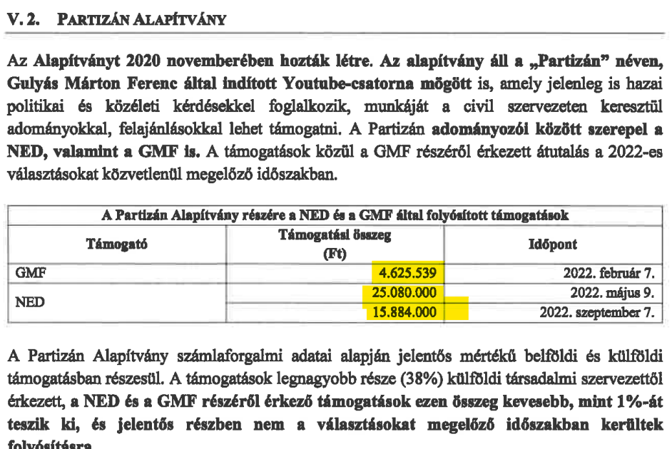 - Gulyás Márton korábban egy videóban ismerte el, hogy az amerikai National Endowment for Democracy (NED) 98 ezer dolláros, azaz 34 millió forintos támogatást nyújtott a Partizán 2022-es választási roadshowjára. Ez a szervezet korábbi kutatásunk szerint csak 2024-ben 9,2 millió dollárt költöttek a háborús Ukrajnában és az elmúlt években a háború egyik fő finanszírozója volt.10 Megtalálható Zelenszkij pártalapítványa és az őt politikusként megismertető médiahálózat mögött is.11