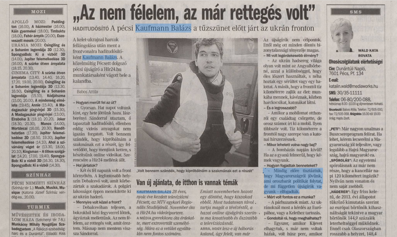 A Tűzfalcsoport feltárta, hogy Kaufmann már 2014-ben Ukrajnában járt hivatalosan, mint haditudósító. Itt már az oroszbarát-vádakat építgette, ahogy az kiderül a hazatérése után vele készült riportból is. Vajon hogy lett a vidéki tudósítóból az orosz beavatkozások ismerője és hadi tudósító éppen azután, hogy évekre eltűnt a nyilvánosságból?