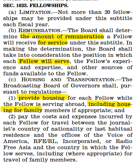 Az ösztöndíj pontos tartalmába egy 2003-as szenátusi feljegyzés ad betekintést (a dokumentum 25791-es szakaszában, a "C" alcím alatt),21 amelyről beszédes módon a külföldi diplomáciai befolyást erősítő tevékenységek körében tárgyaltak az amerikai törvényhozás felsőházában. A feljegyzés szerint évente 20 főt választanak ki globálisan, akiknek a program állja az útiköltségeit, a saját, és szükséges esetben családtagjainak elszállásolását, valamint egy egyedileg megállapított "ellentételezést" is fizetnek az ösztöndíjas szolgálatáért (sic!).